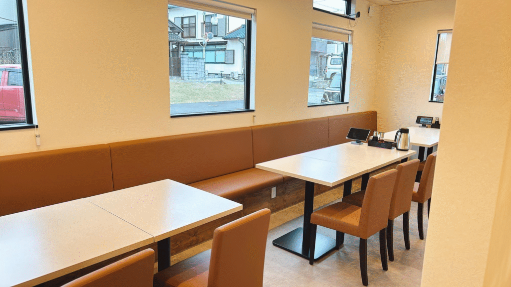 窓がたくさんある明るい店内で、広めのテーブル席のほか、2人掛け、カウンター席もあり、大人数でも一人でも訪れやすい雰囲気です。