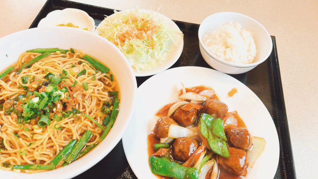 メインが肉団子・回鍋肉・麻婆豆腐などから選べるほか、ラーメンの味も選べます。