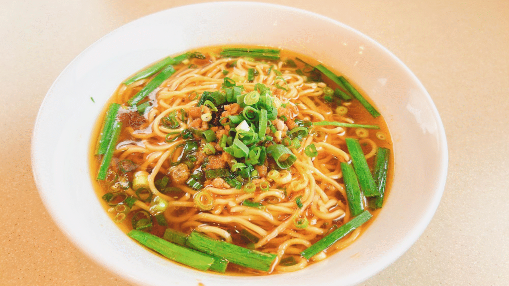 台湾ラーメンは醤油ベースのスープに挽肉とニラやネギがのり、ピリっと辛みが効いています。
