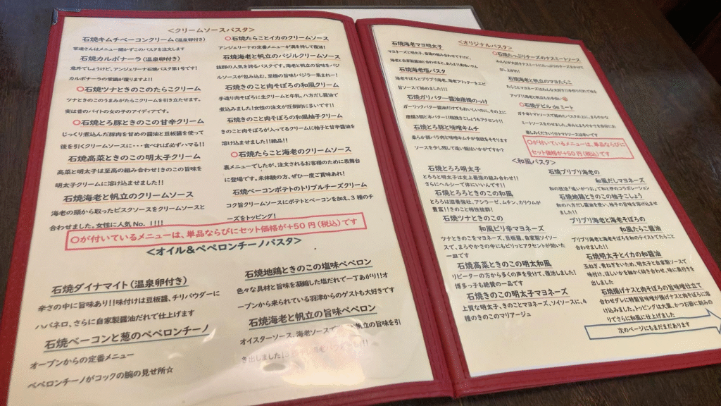 さらに次のページにもパスタメニューが続き、季節限定メニューなどもあるのでどれにしようか迷うこと間違いなしです。