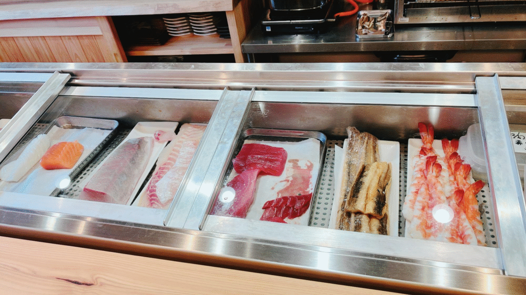 真新しいカウンターの前には新鮮なネタがずらりと入ったショーケースが設置されています。
