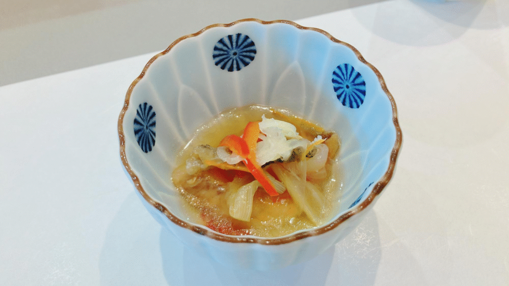 この日の小鉢は白身魚に甘酢をかけたものでした。