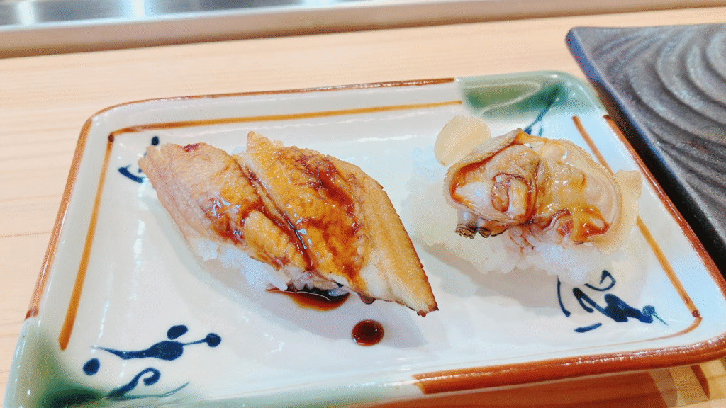 お寿司はカウンターに置かれたお皿に一貫ずつ握って出してもらえるスタイルです。