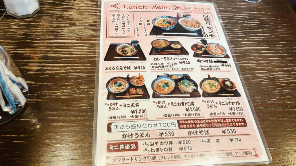 喫茶店には珍しいと思いますが、うどんやそばといった和風のメニューが楽しめますよ。