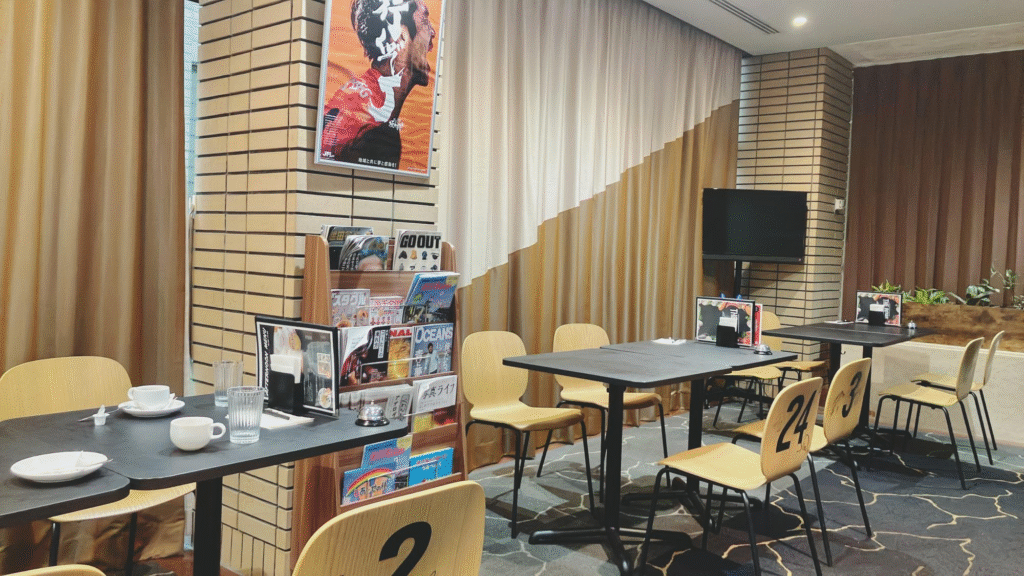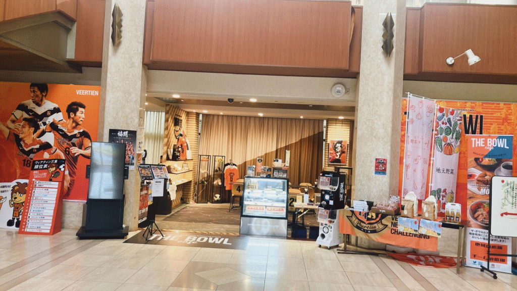 VEERTIEN MIE のオフィシャルサポーターカフェで、店内では試合の様子が映し出されています。