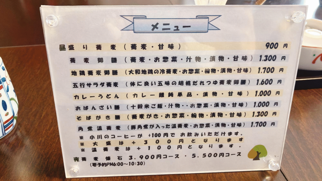 盛り蕎麦以外のメニューはお惣菜、汁物、漬物、甘味がついてメインが変わるようです。