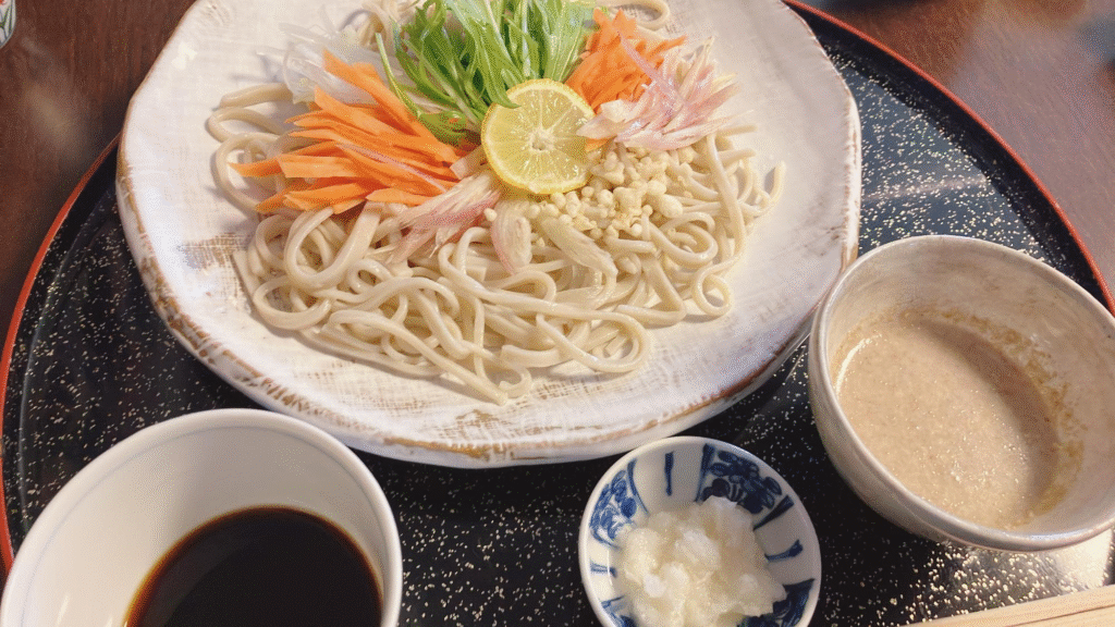 お蕎麦の上に色鮮やかな野菜がきれいに盛り付けられていて、普通のそばつゆのほかに胡麻だれつゆも付属なので味変して楽しむことができます。