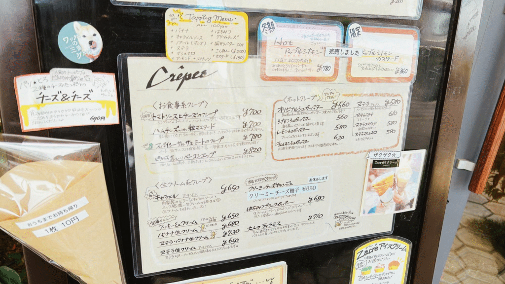 定番の生クリーム系のクレープ以外にも、ホットクレープやお食事系クレープなどが揃っています。