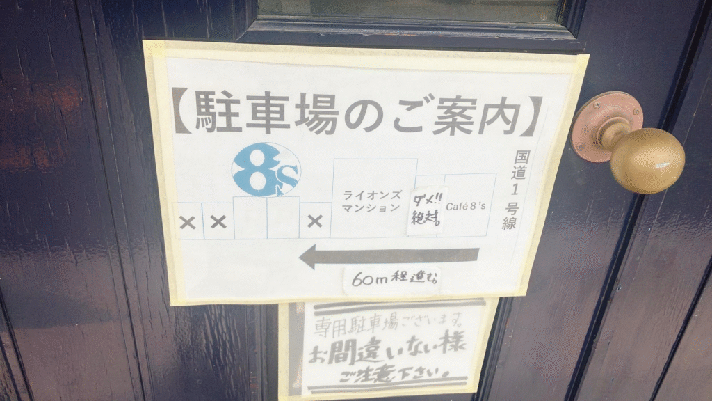 駐車場はお店の前の細道を60mほど西方向に進んだところにスペースがありますが、台数が少ないので乗り合わせがおすすめです。