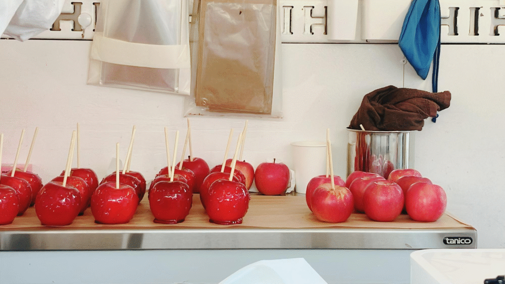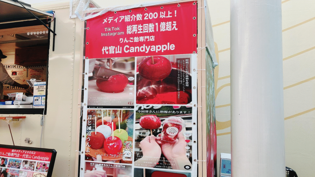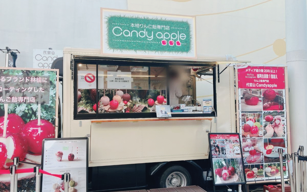 キッチンカーのなかにずらりと並ぶ真っ赤でツヤツヤのりんご飴がかわいいです。