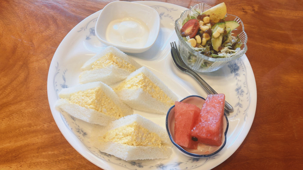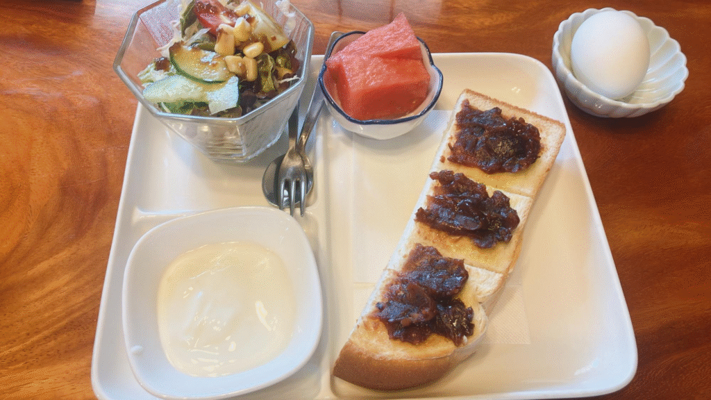 サクもち食感のトーストにゆで卵、サラダ、ヨーグルト、フルーツまでついてドリンク代のみはとてもお値打ちなのではないでしょうか。