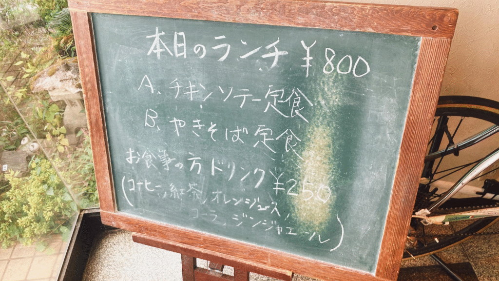 本日のランチの内容は、店内入口の黒板に書かれています。