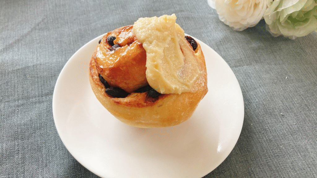 シナモンのいい香りのパンに、レーズンやチョコレートがたっぷりと練りこまれていて、表面にはクリームも!