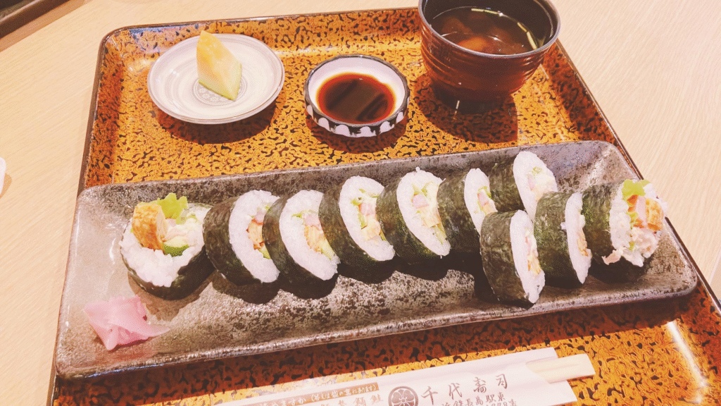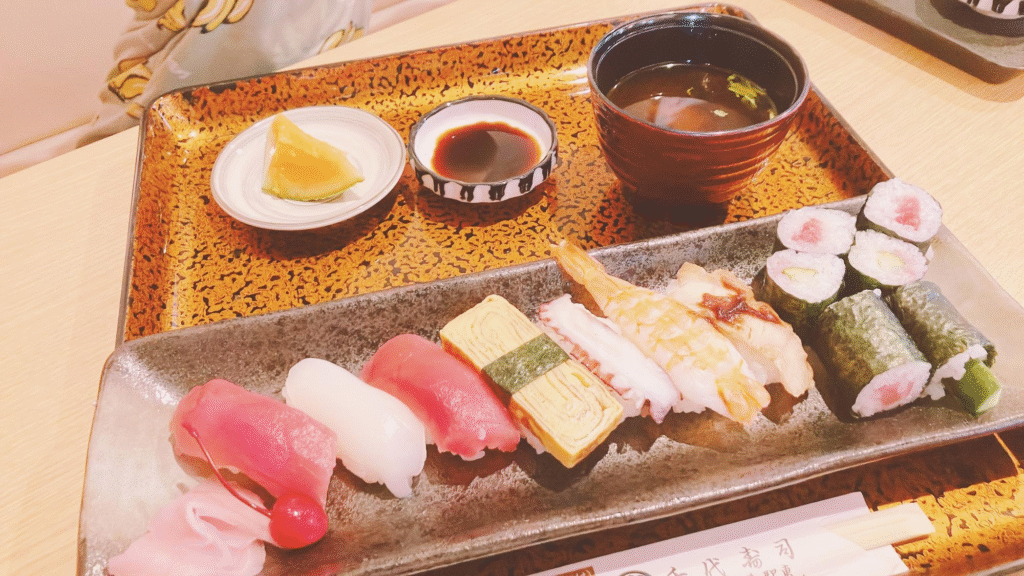 ネタは日によって変わりますが、この日はマグロ、イクラ、海老、出汁巻き玉子などなど具材がたっぷりで豪華でした。