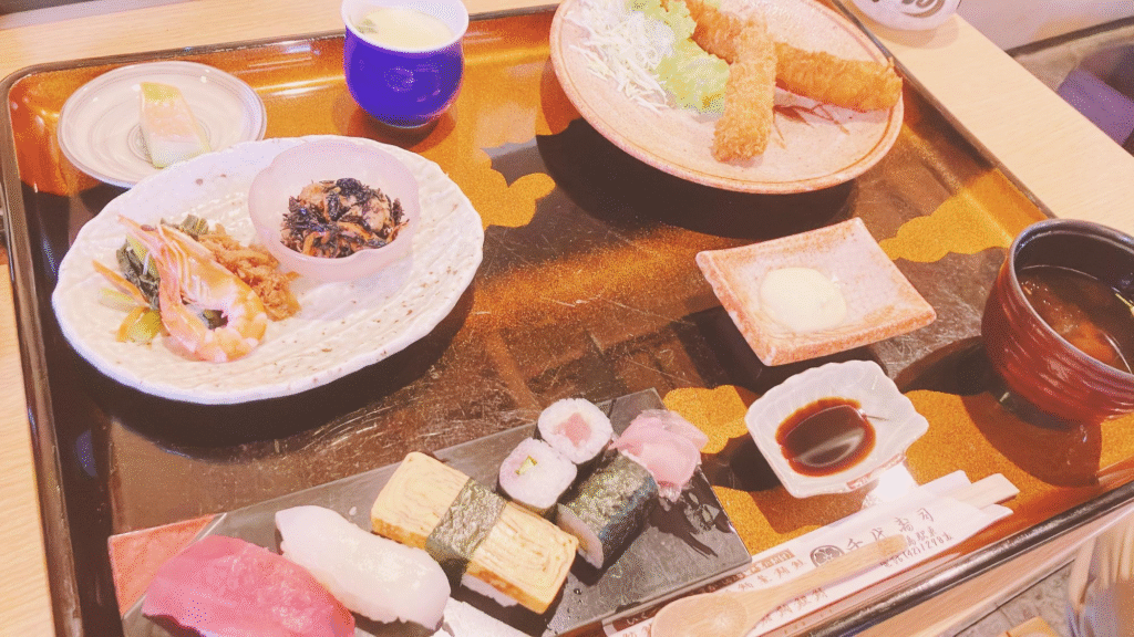 お寿司と名物のエビフライが同時に楽しめる贅沢セットですね。