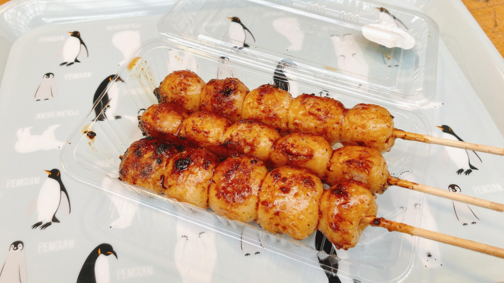 名物のみたらし団子は甘くないタイプで、外はカリッと中はモチモチ!