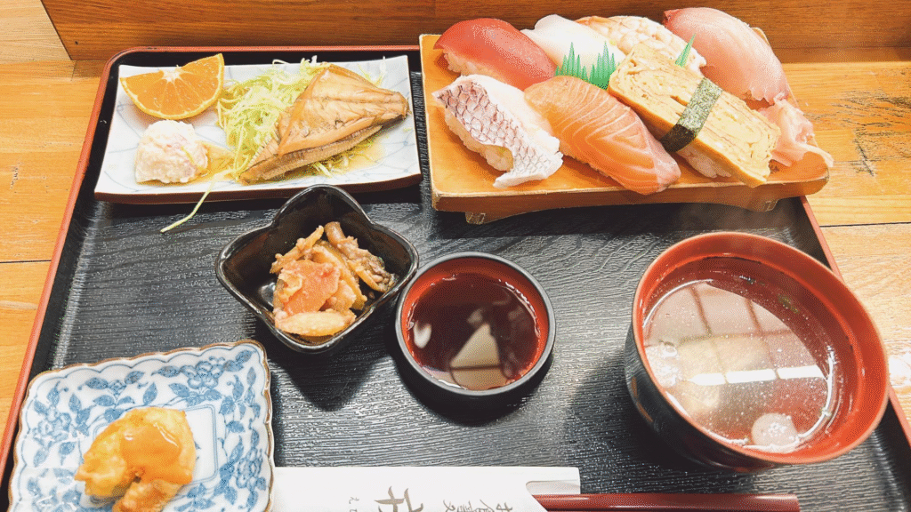 日替わりのお寿司7貫、お吸い物や小鉢類、果物までついて、いろいろ食べられるのが嬉しいです。