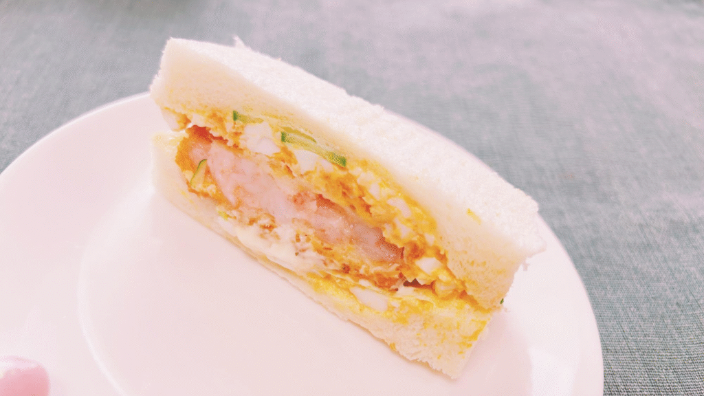 エビカツサンドも、サクサクのエビカツだけでなくつぶし卵がたっぷり入ってボリューム満点です。