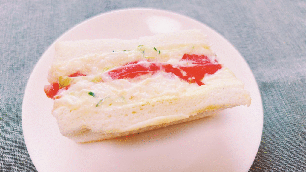 野菜サンドには大きなトマトとたっぷりのポテトサラダが入っています。