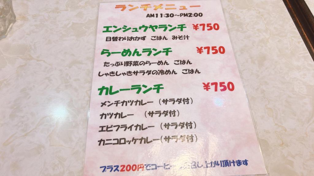 カレーやラーメンのランチのほか、日替わりのエンシュウヤランチもあり、すべて750円ととてもリーズナブル!