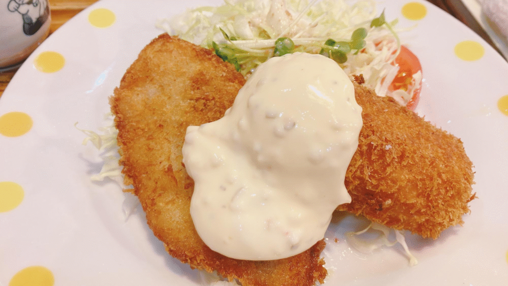 揚げたてサクサクのフライにはタルタルソースがたっぷりとかかっています。