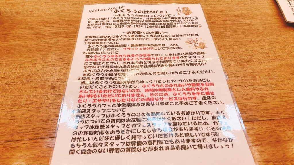 ふくろうカフェの注意事項はこちらです。