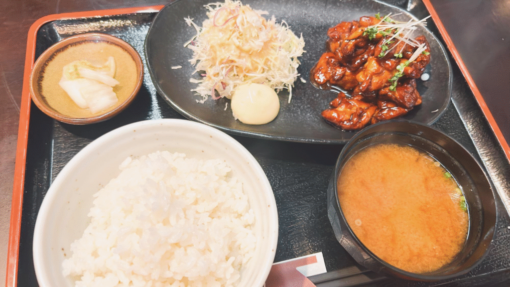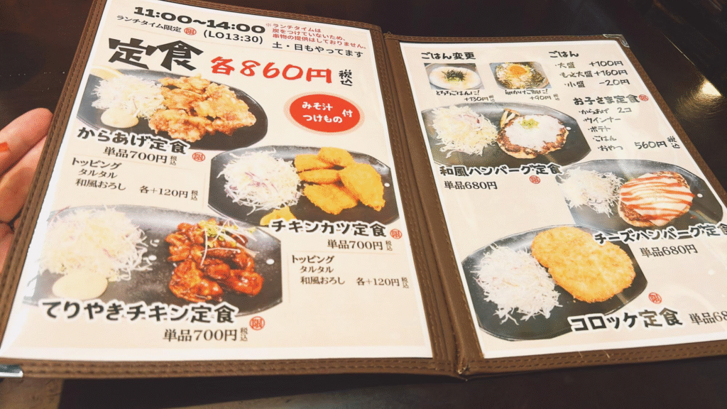 からあげ、チキンカツ、ハンバーグなど各種定食が税込860円で楽しめるのは嬉しいですね。