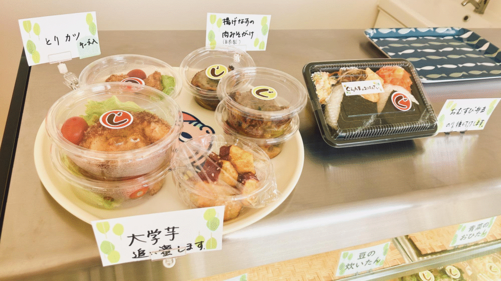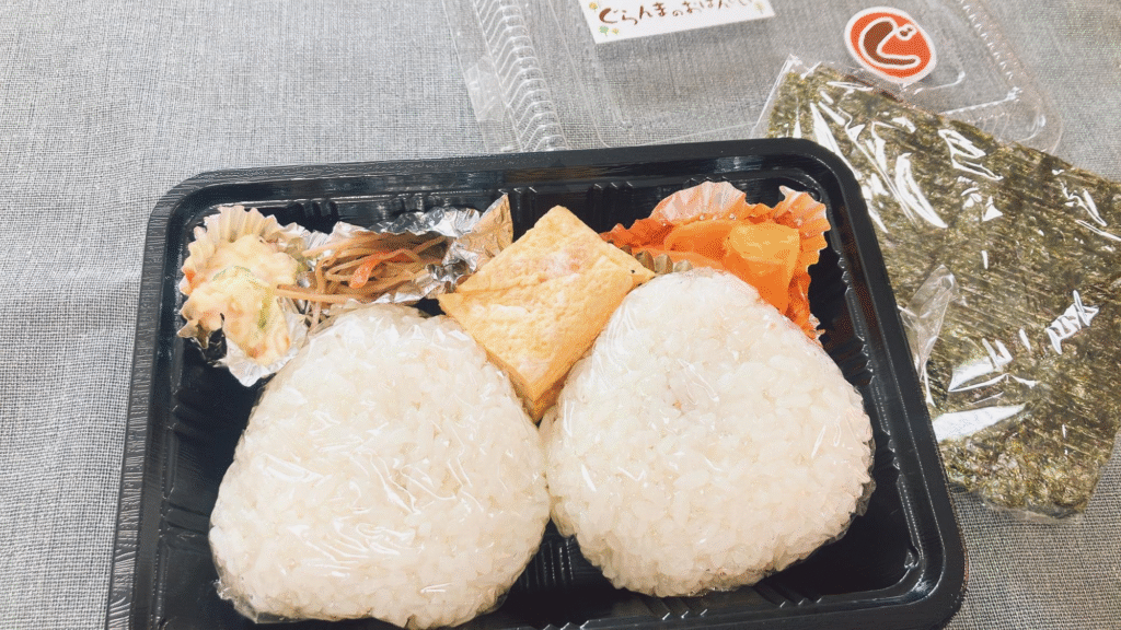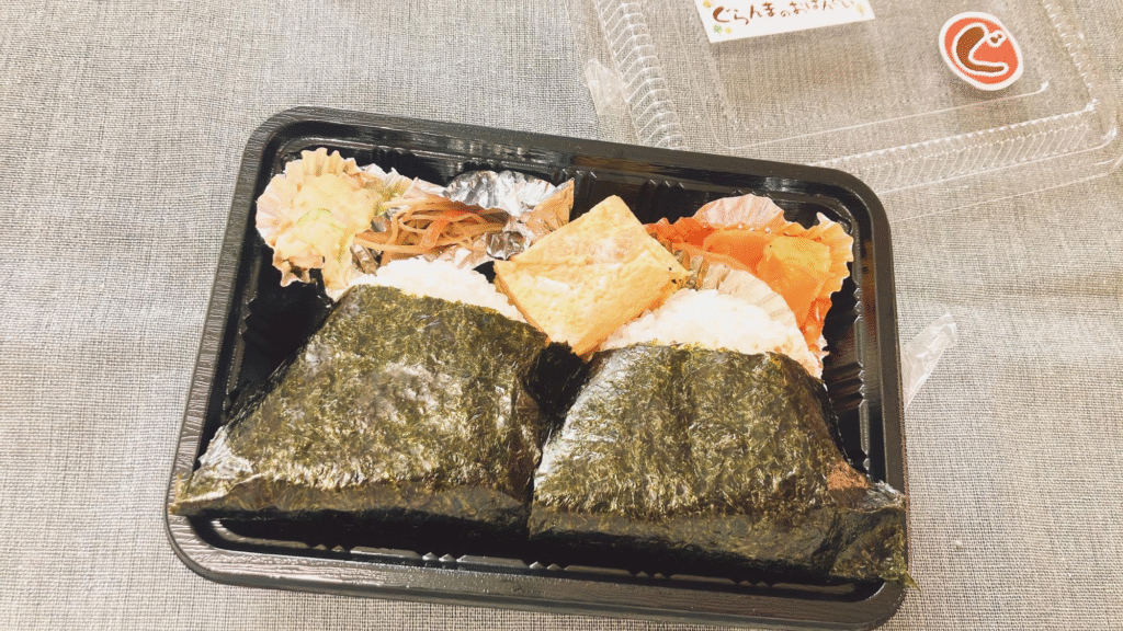 この日はおにぎりでしたが、日によって異なる味ごはん+お惣菜数品入って500円以下で購入できるのでお得です。