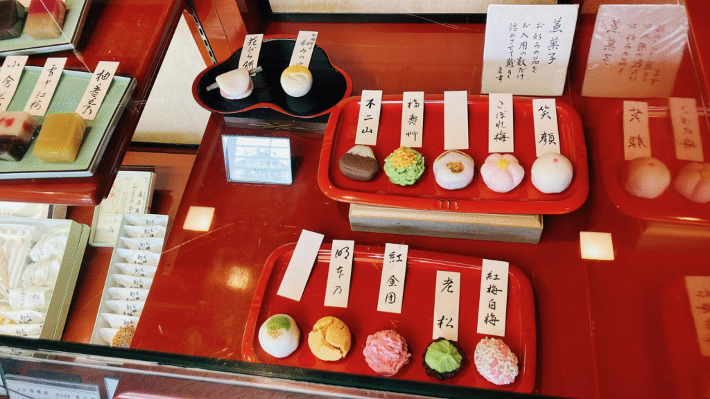 店内に入ると、季節の上生菓子や羊羹の美しさが目に止まります。