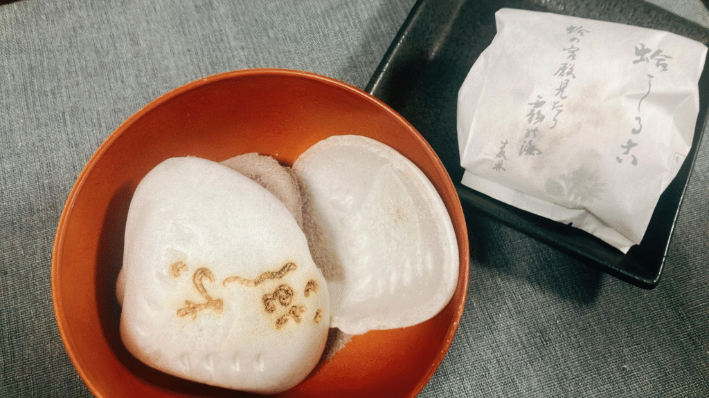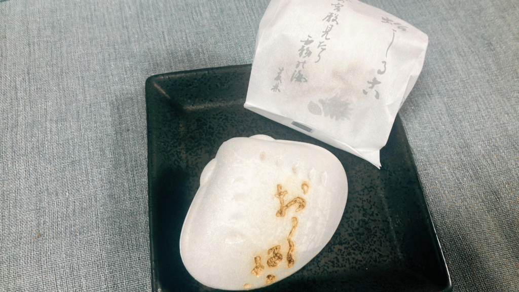 手のひらサイズのハマグリ形で最中の皮の中に粉状のあんこがたっぷりと入っています。