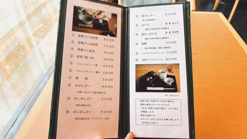 店頭に並んでいる好きな和菓子を選んでお抹茶と一緒にいただくことができるセットや、ぜんざいなど和のスイーツがどれもおいしそうです。