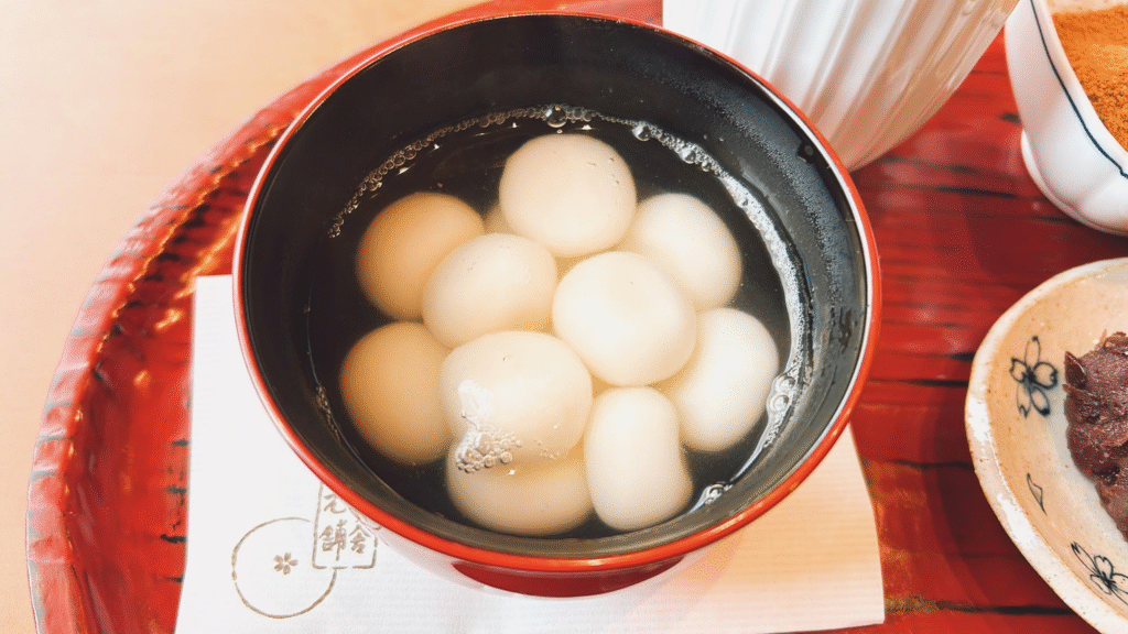 白玉はお湯に入っているので、時間が経っても冷めにくくモチモチの食感を楽しむことができます。