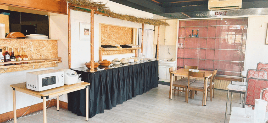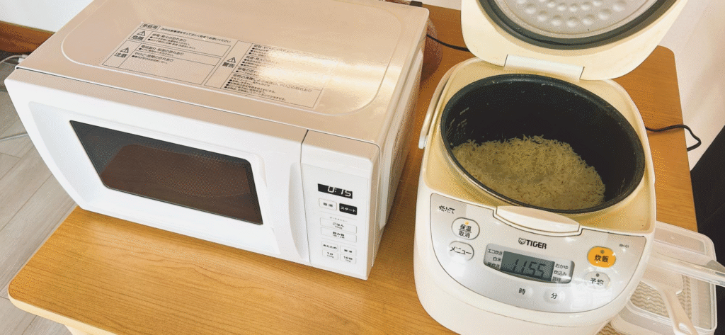 据えられたレンジで温めて食べるとよりおいしく食べられますよ。