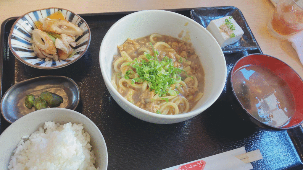 カレーうどんでもお味噌汁をつけるかどうか選べますよ。