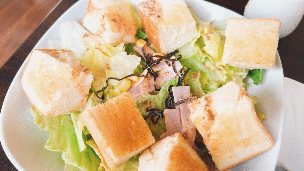 大きなボウルにたっぷりと入ったサラダの上に、厚切りのトースト1枚分のパンがのっています。