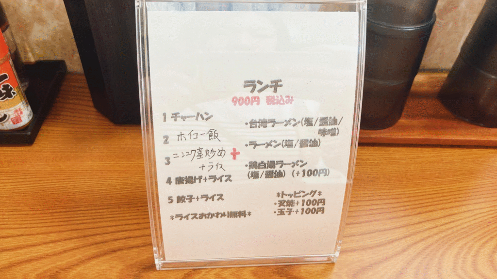 昨年夏のオープン時にはメニューはほぼ鶏白湯ラーメンのみで、餃子やチャーハンがある程度でしたが、メニューが増えていろいろな種類の中華料理を楽しむことができるように変わっていました。