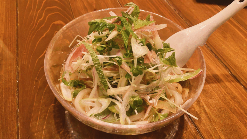 メニュー名に偽りなしで、うどんが見えないほどの薬味に驚きます。