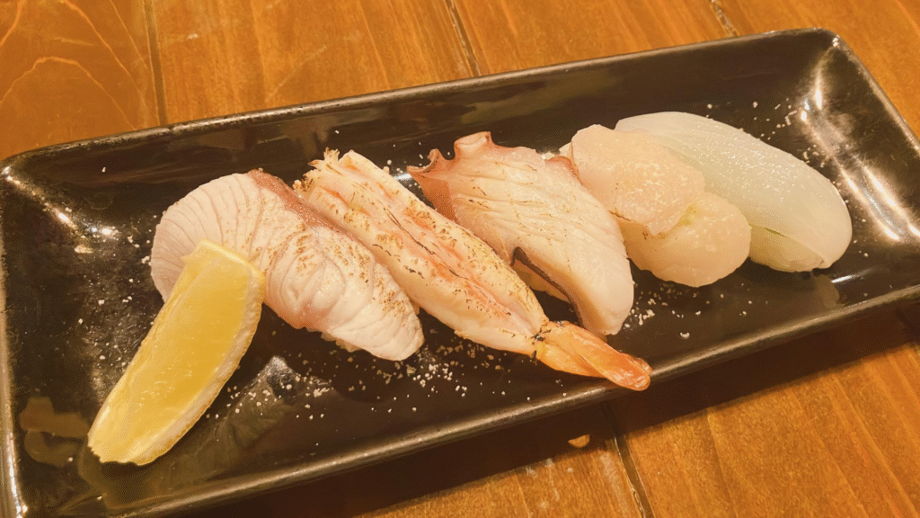 軽く炙られたネタに塩レモンがよく合っていて、塩で食べるお寿司のおいしさに驚きました。
