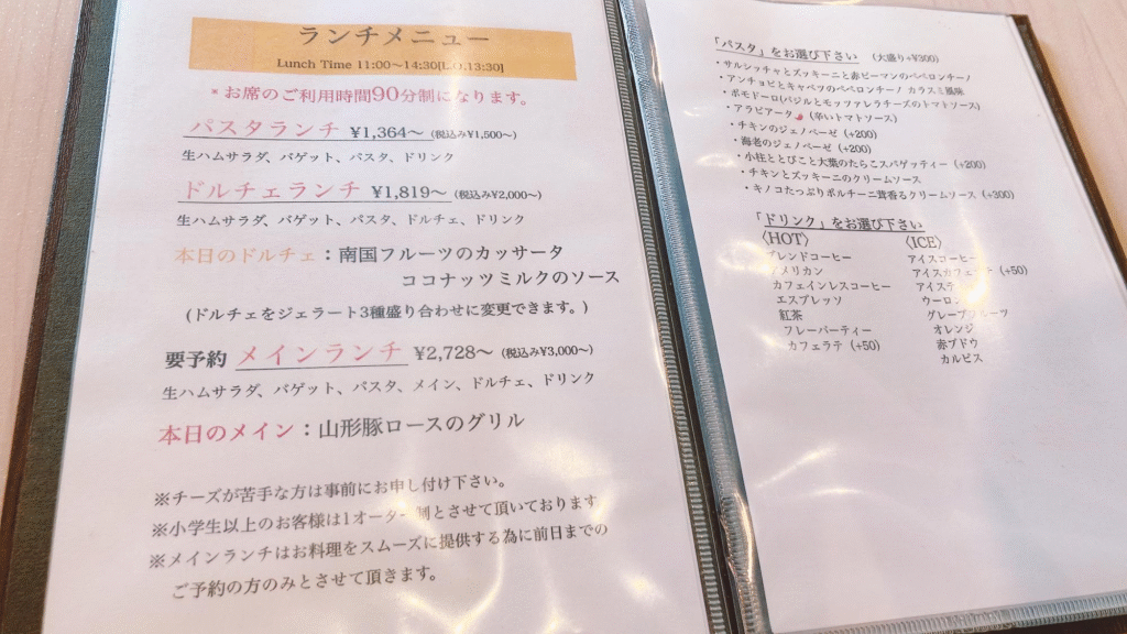 パスタランチ、ドルチェランチ、メインランチ(要予約)があり、右のメニューからパスタとドリンクを選ぶ形式です。
