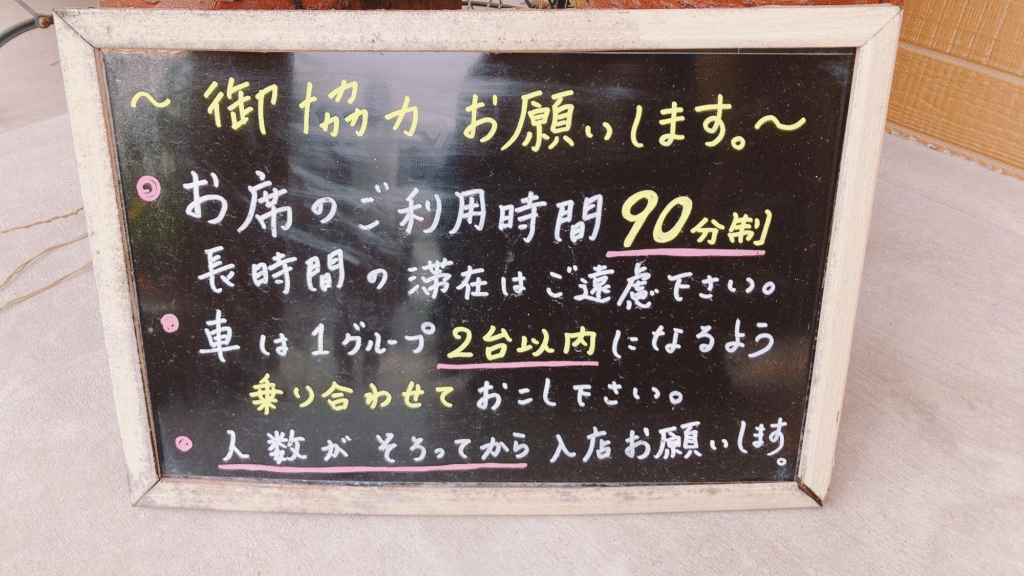 今回は駐車場が空いていたのでダメ元でラストオーダー時間間近に滑り込みで入店したところ予約なしでも入れましたが、電話予約をおすすめします。