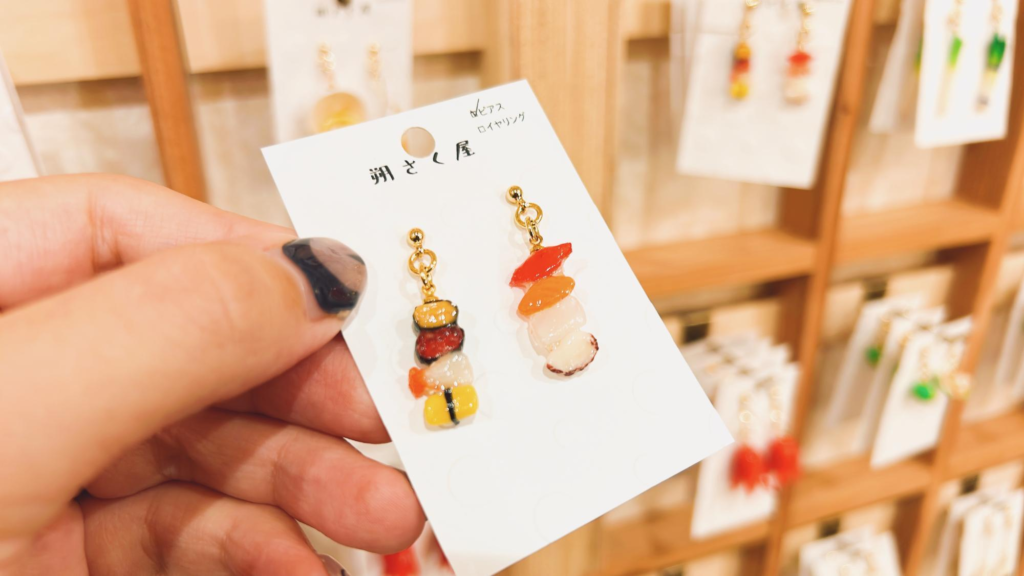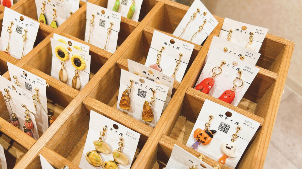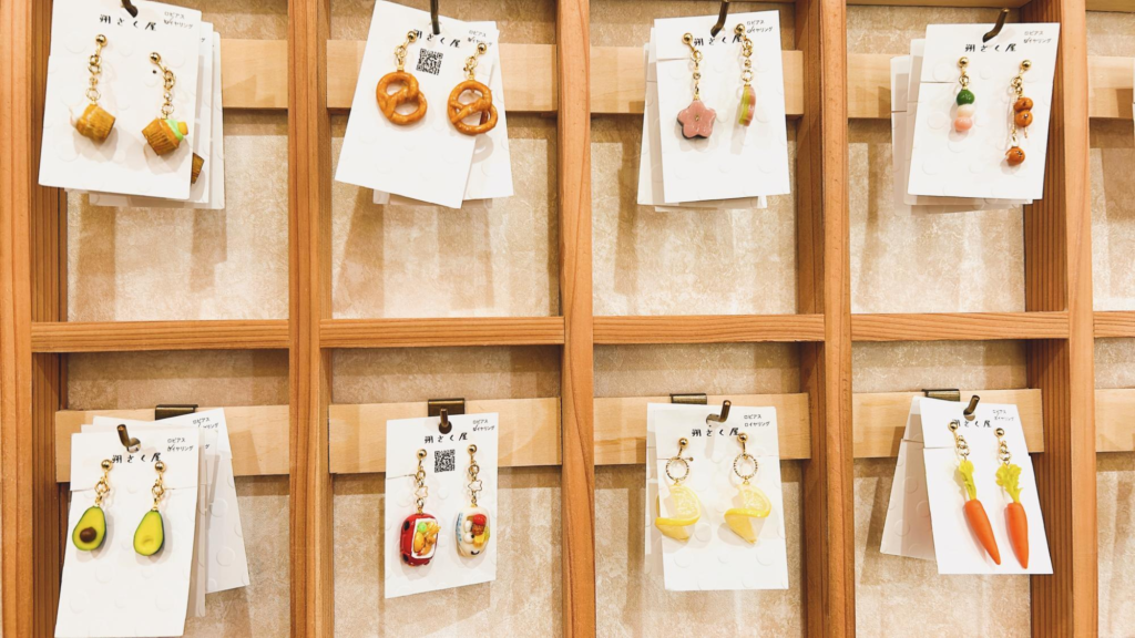 壁面に並ぶアクセサリーはすべてミニチュアの食品サンプルでつくったピアスやイヤリングです。