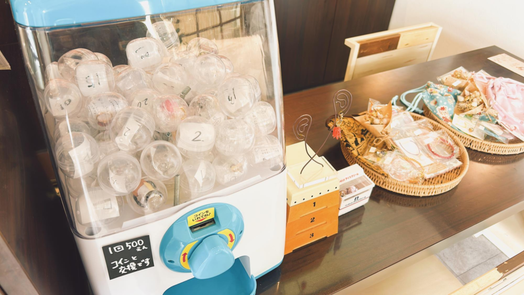 レジ横に置かれた1回500円のガチャでは、いろいろな作家さんの雑貨やアクセサリーが当たるそうで、こちらも面白いなと思いました。