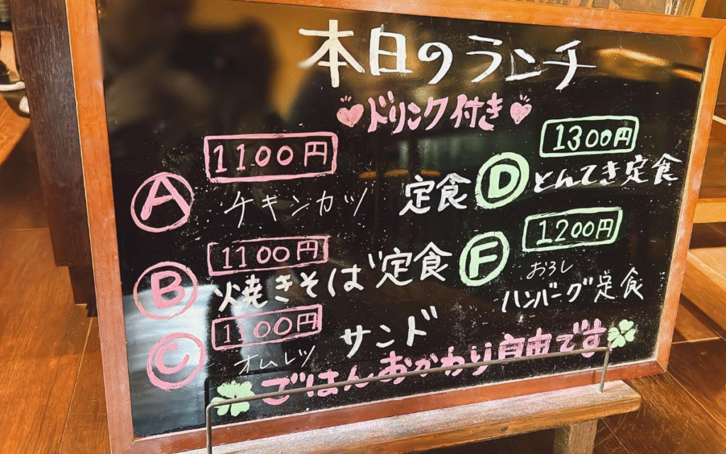 ランチの内容は日によって内容が変わりますが、手ごろな価格でごはんおかわり自由、ドリンク付きは嬉しいですね。