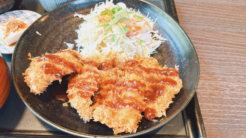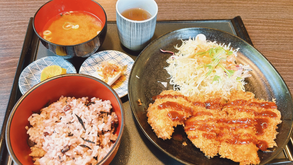 メインに加えてごはん、みそ汁、小鉢、漬物、お茶付です。