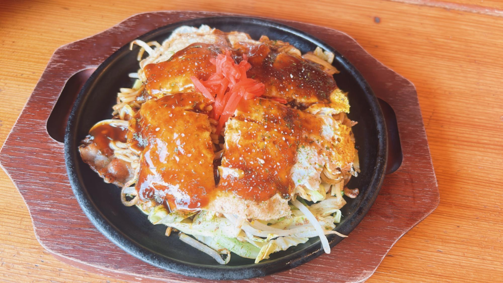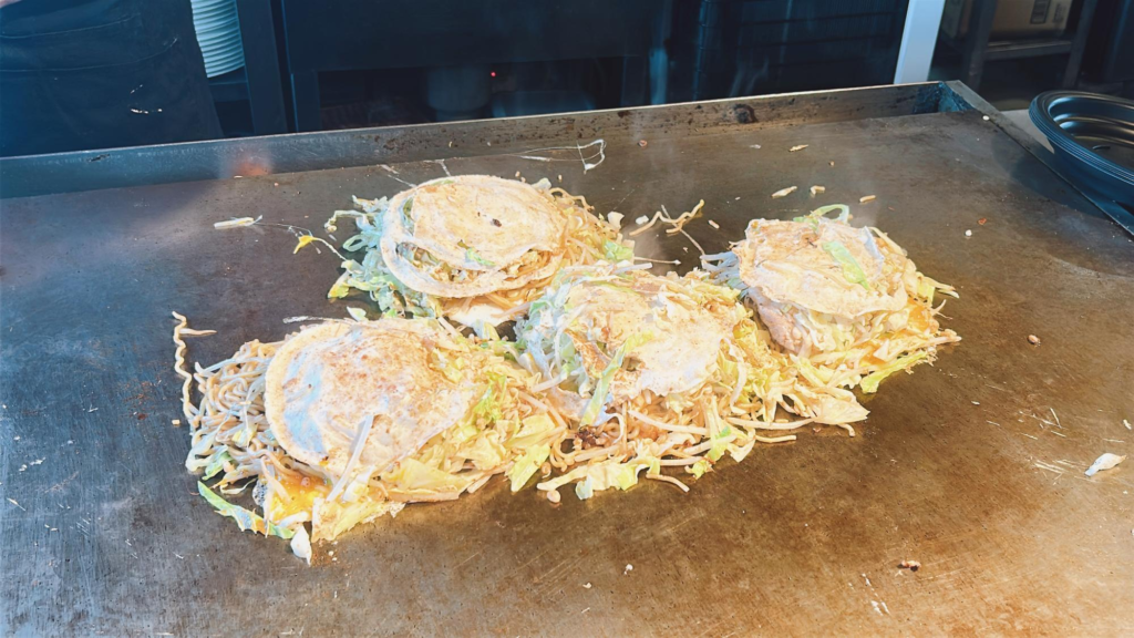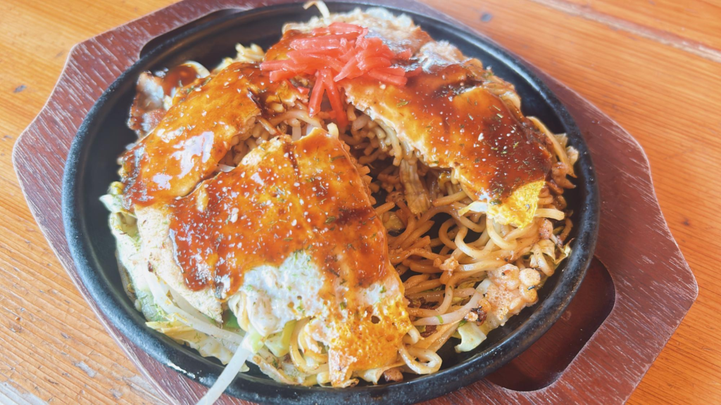 広島風のため、薄い生地に焼きそばが入っています。