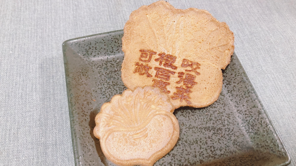 かぶら煎餅には由来となった漢文『咬得菜根百事可做』の焼印が押されています。