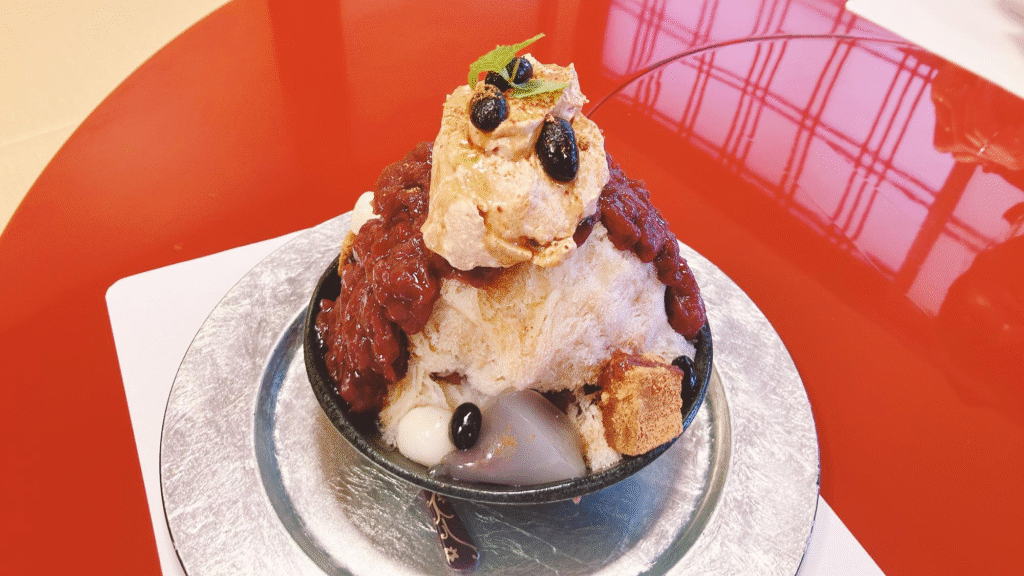 かき氷の上には北海道十勝産のあずきが贅沢に盛り付けられています。