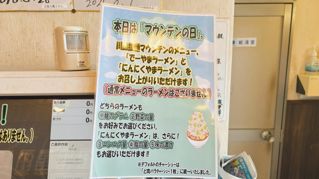 最近、本店である川出拉麺店で水曜日はマウンテンの日となりました。