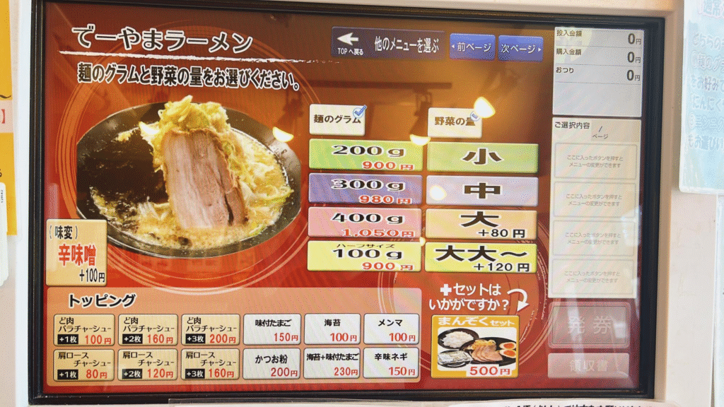 でーやまラーメンは、麺の量と野菜の量が選べます。