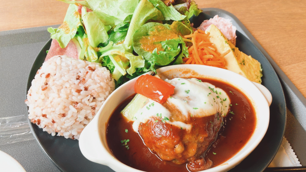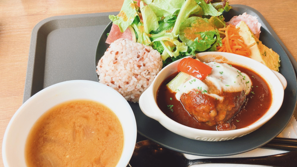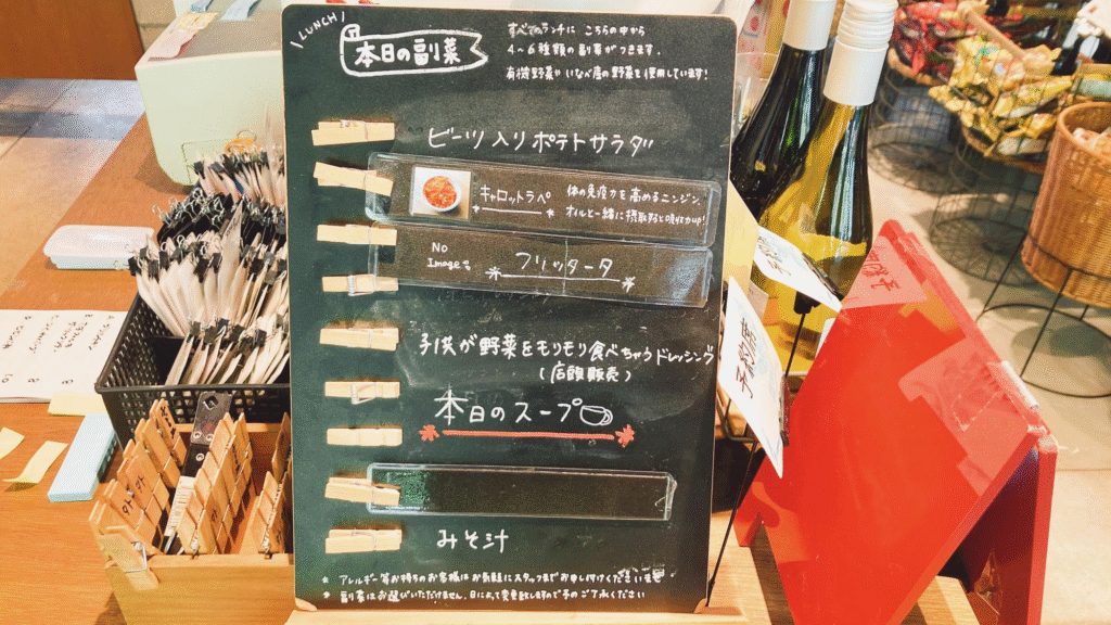 食材にこだわったオーガニックプレートランチで、この日はハンバーグやチキン、さばフィレなどのメニューが並んでいました。